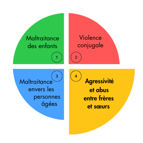 Les recherches sur la violence familiale montrent systématiquement que les abus les plus courants envers les enfants sont perpétrés par un frère ou une sœur, et qu'ils sont plus nombreux que les abus commis par les parents, l’intimidation par les pairs et la violence entre partenaires intimes réunis. Pourtant, les recherches clarifiant ce phénomène sont rares, et notre culture l'accepte comme étant normal. Nous acceptons les taquineries et les insultes, un certain niveau de bagarre, les chamailleries et les querelles. Nous avons tendance à qualifier tous les conflits entre frères et sœurs de « rivalité fraternelle ».Cependant, les formes de violence entre frères et sœurs s’inscrivent sur un continuum allant du conflit à l’abus ou à la maltraitance.