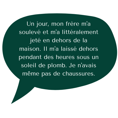 Sur les dix formes d'intimidation, qui concernaient principalement des abus verbaux et relationnels, cinq répondants sur six ont déclaré avoir subi une ou plusieurs de ces formes d'intimidation de la part de leurs frères et sœurs les plus proches en âge au cours de leur adolescence.